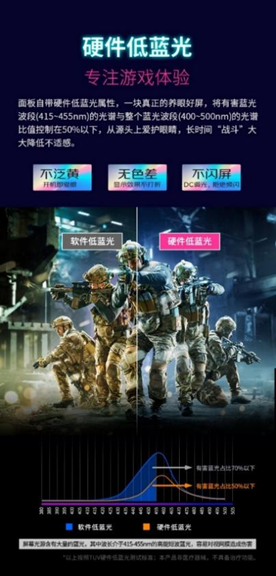优派XG273-4K-OLED配备硬件低蓝光技术,将有害蓝光波段的光谱与整个蓝光波段的光谱比值控制在50%以下,确保屏幕不泛黄、无色差、不闪屏,从源头上保护用户眼睛,长时间专注游戏战斗也无不适感。