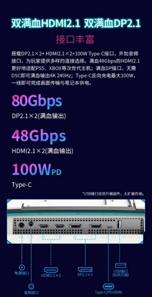 接口方面,优派XG273-4K-OLED配备新一代DP2.1 x 2、HDMI2.1 x 2和100W Type-C,外加音频接口,为玩家提供多样的连接选择。其中,双满血HDMI2.1可更好地适配PS5、XBOX等次世代主机;双满血DP2.1接口,无需显示流压缩(DSC)即可输出4K分辨率下240Hz,让细腻的纹理细节和丰富的色彩层次都毫无保留地展现在用户眼前;Type-C还可高达100W反向充电,一线即可完成画面传输与笔记本供电。