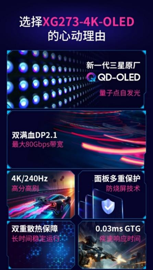 26.5英寸的优派XG273-4K-OLED采用最新一代OLED面板,融合量子点色彩和像素级独立控光技术,提供更纯净的色彩、更广的色域和更高的峰值亮度,同时保持OLED的高对比度和快速响应时间。同时,XG273-4K-OLED配备图像清理、像素偏移、屏幕均匀亮度、静态图标检测四大防烧屏技术,为屏幕建立起多重防护措施,避免烧屏风险、延长屏幕寿命和保护屏幕健康。